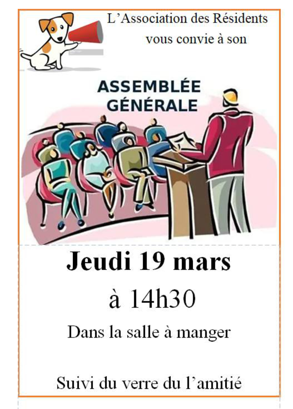 L’Association des Résidents invite ses membres à participer à son assemblée générale, jeudi 19 mars à 14 h 30. La rencontre se tiendra dans la salle à manger de la résidence, comme chaque année. Un moment d’échange officiel suivi d’un verre de l’amitié pour clore la journée dans la convivialité.