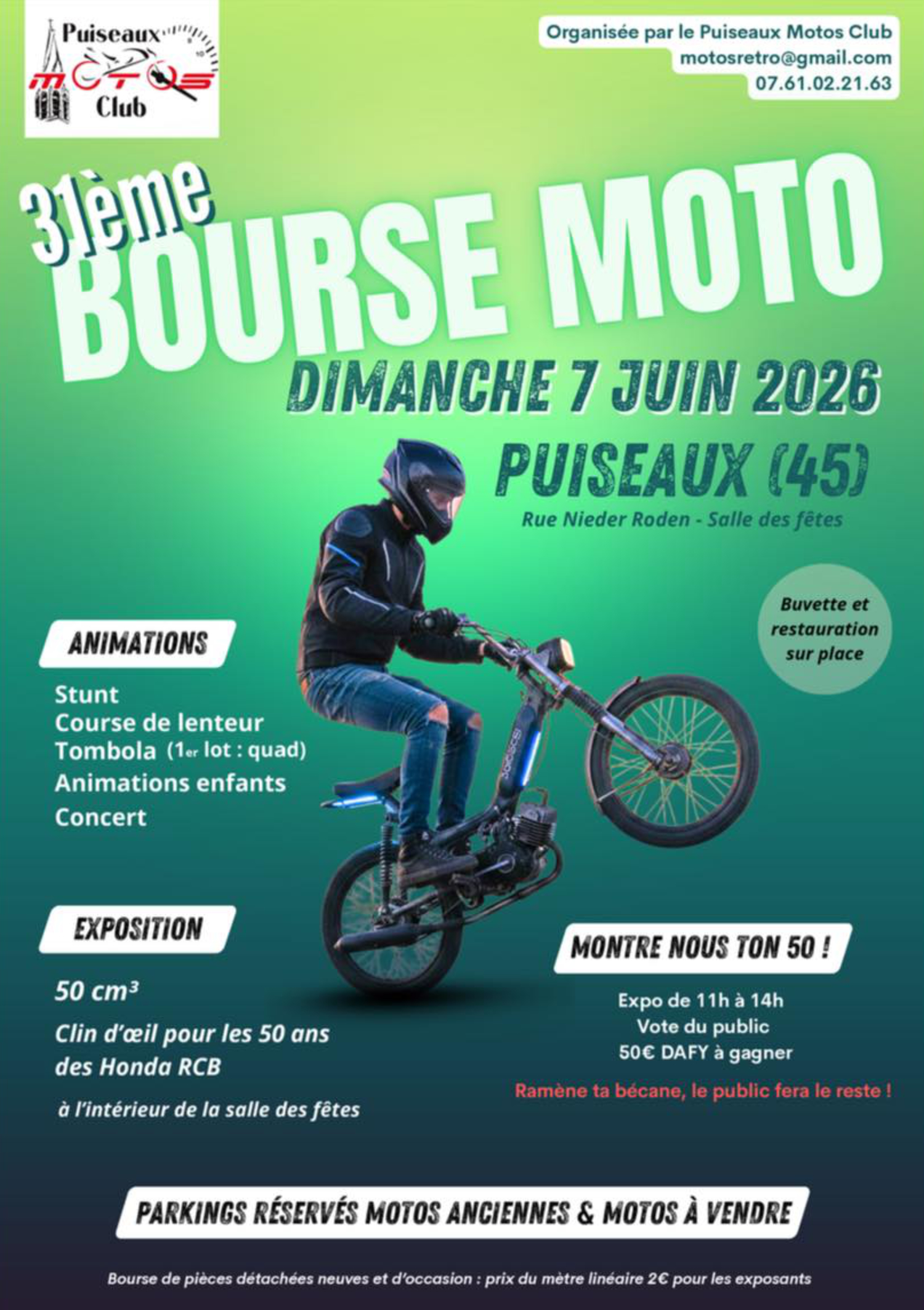 Ce dimanche 7 juin, la salle des fêtes de Puiseaux accueillera une nouvelle édition de sa bourse aux motos. Au programme : vente de pièces, accessoires et motos d’occasion, mais aussi une exposition spéciale pour célébrer les 50 ans des Honda RCB. Les visiteurs pourront découvrir ces modèles emblématiques de 11 h à 14 h et participer à un vote pour élire leur préféré, avec 50 euros en bon d’achat DAFY à la clé.