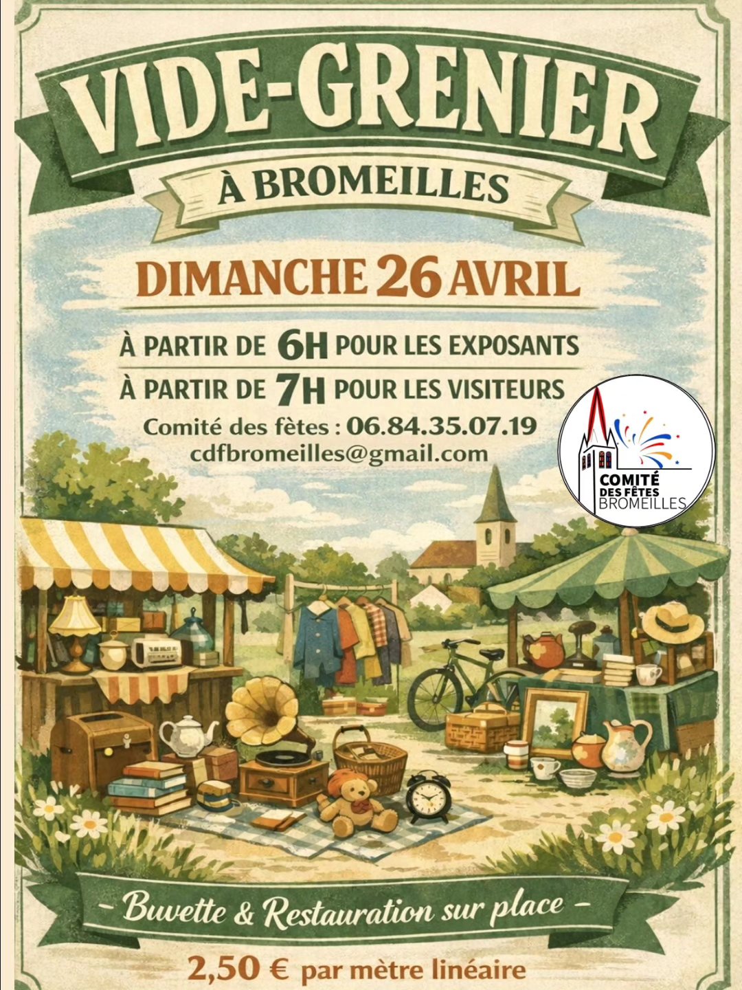 Les personnes souhaitant réserver un emplacement peuvent contacter le Comité des fêtes au 06.84.35.07.19 ou par courriel à l’adresse cdfbromeilles@gmail.com. L’accès reste libre pour les visiteurs, qui pourront flâner entre les stands dès l’aube.